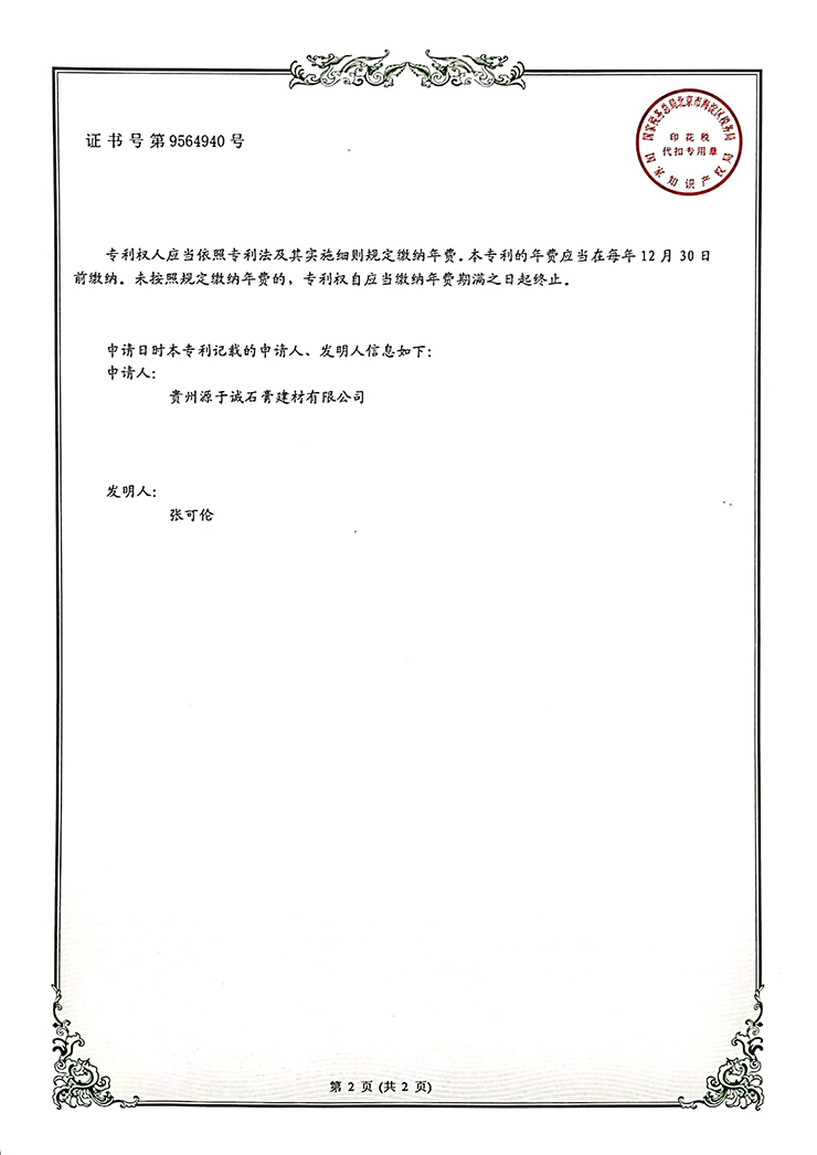 專利證書(一種多功能紙面石膏板生產(chǎn)裝置)